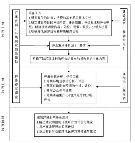 環境影響評價的主要工作內容為闡明項目所在區域環境質量現狀,充分考慮可能存在的環境問題和環境制約因素,評價本項目發展規模和布局等環境合理性;分析預測項目實施后可能造成的各類環境影響,針對不利影響提出環境保護策措施,工作程序見下圖。