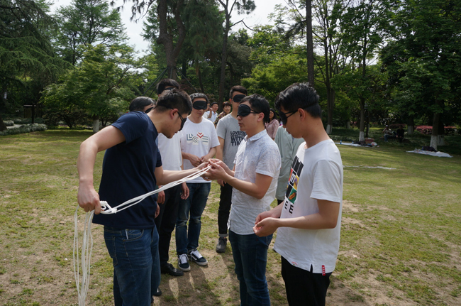 盲陣是花了最長時間的一個項目。在聽到項目要求后,大家紛紛獻計獻策,經過充分的討論,得出了“可行性研究報告”,后期執行時大家只用了10多分鐘就在蒙著眼睛的情況下做出了完全符合要求的圖形。
