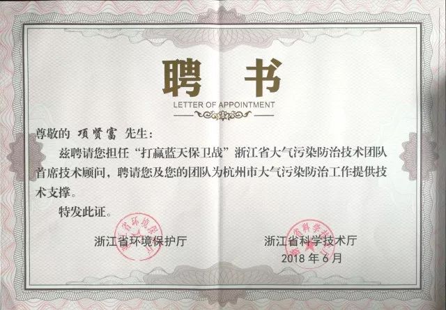 2018年6月12日,浙江省環(huán)保廳和省科技廳聯(lián)合舉行發(fā)布會(huì),宣布建立浙江省大氣污染治理技術(shù)百人專家?guī)欤刚?qǐng)浙江大學(xué)高翔等11位專家教授為大氣污染防治首席技術(shù)顧問,我公司教授級(jí)高工項(xiàng)賢富同志入選。每位首席技術(shù)顧問及其團(tuán)隊(duì)都要定點(diǎn)聯(lián)系浙江一個(gè)地區(qū),領(lǐng)銜解決大氣污染源頭治理問題,用“科技治氣”打響藍(lán)天保衛(wèi)戰(zhàn)。