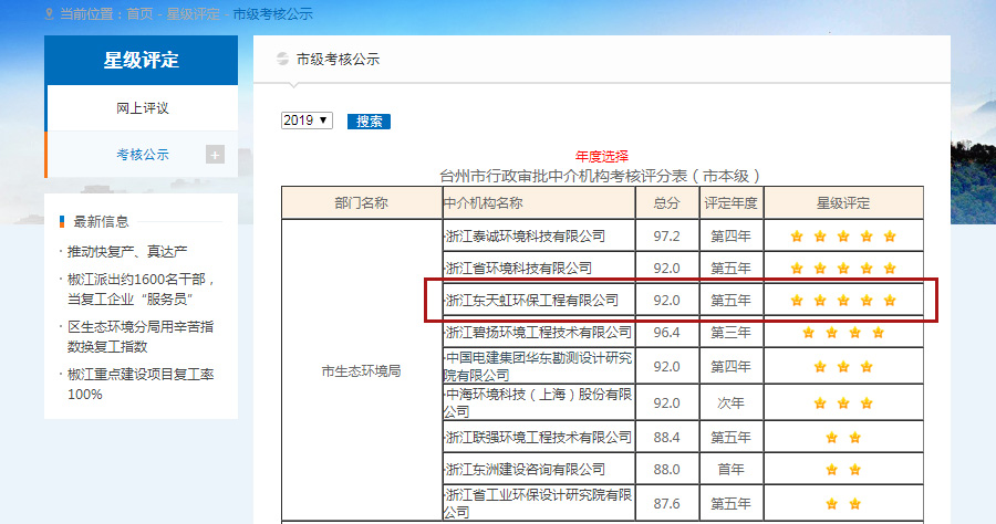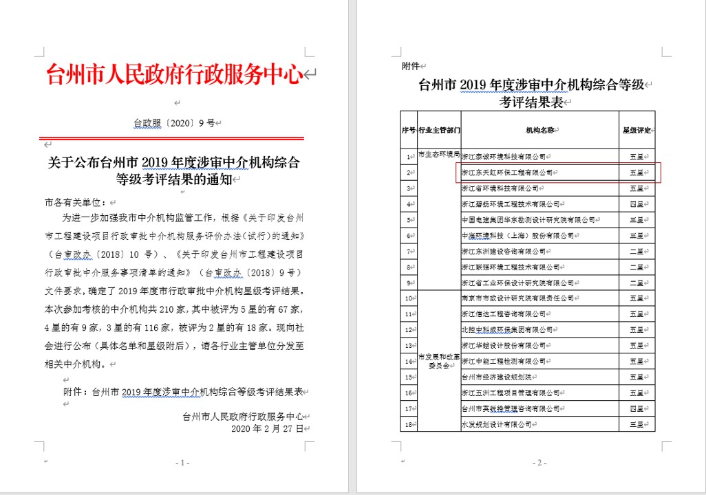 新春伊始,傳來喜報,我司在臺州市2019年度涉審中介機構綜合等級考評中名列前茅,被評為五星級機構。臺州市人民政府行政服務中心從文本質量、執業規范、規范收費、職業道德等方面對參加考核的210家中介機構作出了考評,浙江東天虹環保工程有限公司被評為最高星級——五星!我司已經連續五年在臺州市行政審批中介機構考核榮獲最高星級。