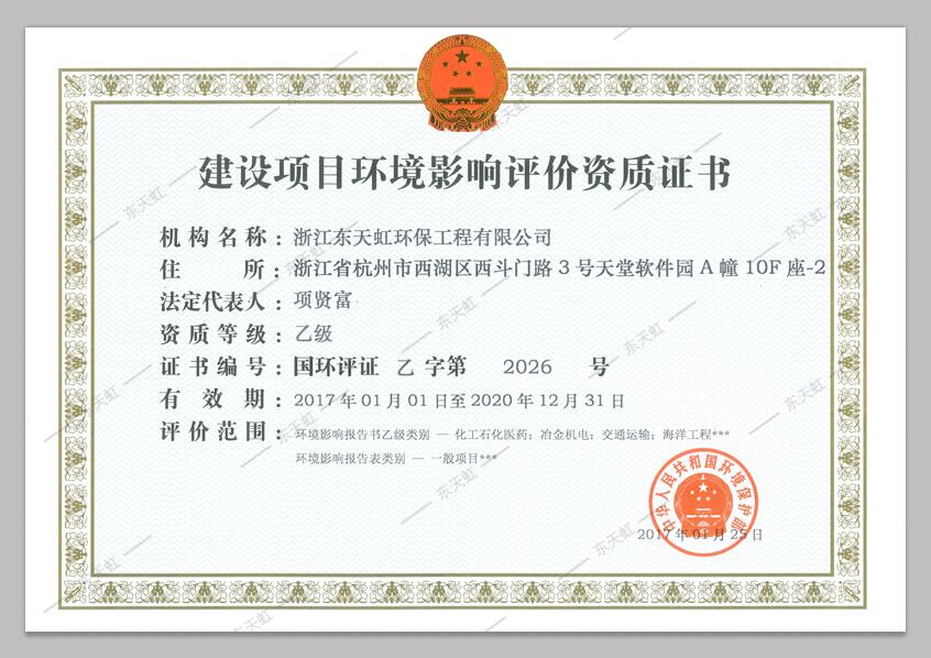 浙江東天虹環(huán)境科技有限公司在成立之初就正式成立環(huán)境評(píng)價(jià)中心,前期著手環(huán)評(píng)技術(shù)隊(duì)伍與裝備建設(shè),并開(kāi)始與其他資質(zhì)單位合作從事環(huán)境影響評(píng)價(jià)咨詢服務(wù)工作;2005年6月30日被批準(zhǔn)授予國(guó)環(huán)評(píng)證乙字第2026號(hào)證書(shū)(一般環(huán)境影響報(bào)告表);2008年6月獲準(zhǔn)資質(zhì)范圍調(diào)整,增加社會(huì)區(qū)域類、化工石化醫(yī)藥類環(huán)境影響報(bào)告書(shū)評(píng)價(jià)范圍;2010年6月獲準(zhǔn)資質(zhì)范圍調(diào)整,增加冶金機(jī)電類環(huán)境影響報(bào)告書(shū)評(píng)價(jià)范圍。隨著公司的不斷發(fā)展,2012年公司的環(huán)評(píng)資質(zhì)又獲得2項(xiàng)資質(zhì)范圍調(diào)整,增加了交通運(yùn)輸類、輕工紡織類報(bào)告書(shū)資質(zhì)。2014年8月,獲批準(zhǔn)增加了海洋工程類報(bào)告書(shū)資質(zhì)。環(huán)境影響評(píng)價(jià)工作注重質(zhì)量管理,實(shí)行嚴(yán)格的審核體系,公司環(huán)評(píng)質(zhì)量審核體系實(shí)行分類、分級(jí)審核體系,一般項(xiàng)目環(huán)評(píng)報(bào)告表實(shí)行二級(jí)審核,復(fù)雜或敏感項(xiàng)目環(huán)評(píng)報(bào)告表和環(huán)評(píng)報(bào)告書(shū)實(shí)行三級(jí)審核,參與審核人員全部為注冊(cè)環(huán)評(píng)工程師。