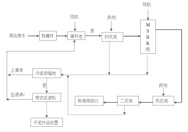混合廢水經格柵井隔去粗大雜物后進調節池,廢水在調節池內借助空氣攪拌實現均質、調節水量并使廢水降溫后通過廢水提升泵提升到初沉池,經投加混凝劑及助凝劑使廢水中所含的大部分SS和部分色度得以去除,初沉池出水進入A池,在缺氧狀態下大分子有機物經水解分解成小分子有機物,提高廢水的可生化性,廢水在O池進行好氧生物處理后,混合液進入SBR池,出水自流入反應池,經加藥反應后進入二沉池進行泥水分離,去除大部分色度和部分CODcr,二沉池出水通過標準化排放井達標排放。沉淀污泥進入污泥濃縮池,污泥濃縮池污泥通過污泥泵進入污泥脫水機械,經脫水后干泥制磚或填埋。